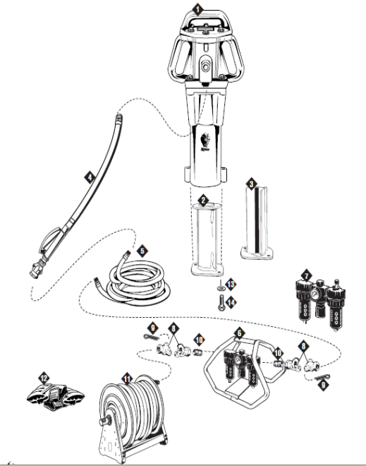 | Illus. Part PD-55 Specifications No. No. All drivers are equipped with the exclusive Rhino Alloy, Double Valve Piston 1 070013 PD-55 Medium Duty Post Driver with a 3 7/8" (98.4 mm) I.D.Master Chuck, uses 42 CFM (1.19 m3/min) @ 90 psi (6.4kg/cm2). Approx. Wt. 54.6 lbs (24.8 kg) 2 070609 3 1/2" (88.9 mm) I.D. Chuck Adapter* 070610 3" (76.2 mm) I.D. Chuck Adapter* 070611 2 1/2" (63.5 mm) I.D. Chuck Adapter* 070612 2" (50.8 mm) I.D. Chuck Adapter* 070613 1 1/2" (38.1 mm) I.D. Chuck Adapter* 070614 1" (25.4 mm) I.D. Chuck Adapter* 3 070617 Channel Post Chuck Adapter - 1.2 to 1.5 lbs/ft Posts* 070618 Channel Post Chuck Adapter - 2 to 2.75 lbs/ft Posts* 070619 Channel Post Chuck Adapter - 3 to 4 lbs/ft Posts* 4 600000 Throttle Valve Kit with 2' (61 cm) Hose Assembly, 2 Couplers,1 Safety Clip. 605006 3/4" (19 mm) Extra Hose (Only Available to Extend Hose Assembly to Desired Length) 5 607000 3/4" (19 mm) Hose Assembly (Order Length Needed) 6 225001 Carrier for Filter-Regulator-Lubricator 7 601128 Filter-Regulator-Lubricator (Used with all Post Drivers for Operator Safety & Post Driver Protection) 8 606600 Air Line Coupler (Optional on F-R-L) 9 606601 Coupler Safety Clip (Optional on F-R-L) 10 230401 Nipple (Optional on F-R-L) 11 100047 Air Hose Reel with 100 ft (30.5 m), 3/4" (19 mm) Air Hose Included 100048 100 ft (30.5 m), 3/4" (19 mm) Air Hose Assembly 100295 Air Hose Reel Only 12 995051 Pair/Anti-Vibration Gloves - Size Small 995052 Pair/Anti-Vibration Gloves - Size Medium 995053 Pair/Anti-Vibration Gloves - Size Large 995054 Pair/Anti-Vibration Gloves - Size X-Large 995055 Pair/Anti-Vibration Gloves - Size XX-Large 13 517702 Compression Washer 14 500178 Cap Screw *Note: Includes Necessary Cap Screws and Compression Washers. |