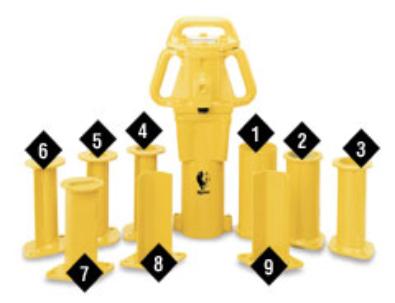 | Rhino PD-55 Post Driver and Chuck Adapters The PD-55 is easily operated by one man and is the perfect choice for driving ground rods, delineator posts and various types of steel posts. Model and/or Specifications Part Number PD-55070013 Medium Duty Post Driver with a 3 7/8" (98.4 mm) I.D. Master Chuck, uses 42 CFM (1.19 m3/min) @ 90 psi (6.4 kg/cm2). Approx. Wt. 54.6 lbs (24.8 kg) 1 070609 3 1/2" (88.9 mm) I.D. Chuck Adapter 2 070610 3" (76.2 mm) I.D. Chuck Adapter 3 070611 2 1/2" (63.5 mm) I.D. Chuck Adapter 4 070612 2" (50.8 mm) I.D. Chuck Adapter 5 070613 1 1/2" (38.1 mm) I.D. Chuck Adapter 6 070614 1" (25.4 mm) I.D. Chuck Adapter 7 070617 Channel Post Chuck Adapter - 1.2 to 1.5 lbs/ft Posts 8 070618 Channel Post Chuck Adapter - 2 to 2.75 lbs/ft Posts 9 070619 Channel Post Chuck Adapter - 3 to 4 lbs/ft Posts 10 070615 2" (50.8 mm) I.D. Heavy Chuck Adapter (not shown) |